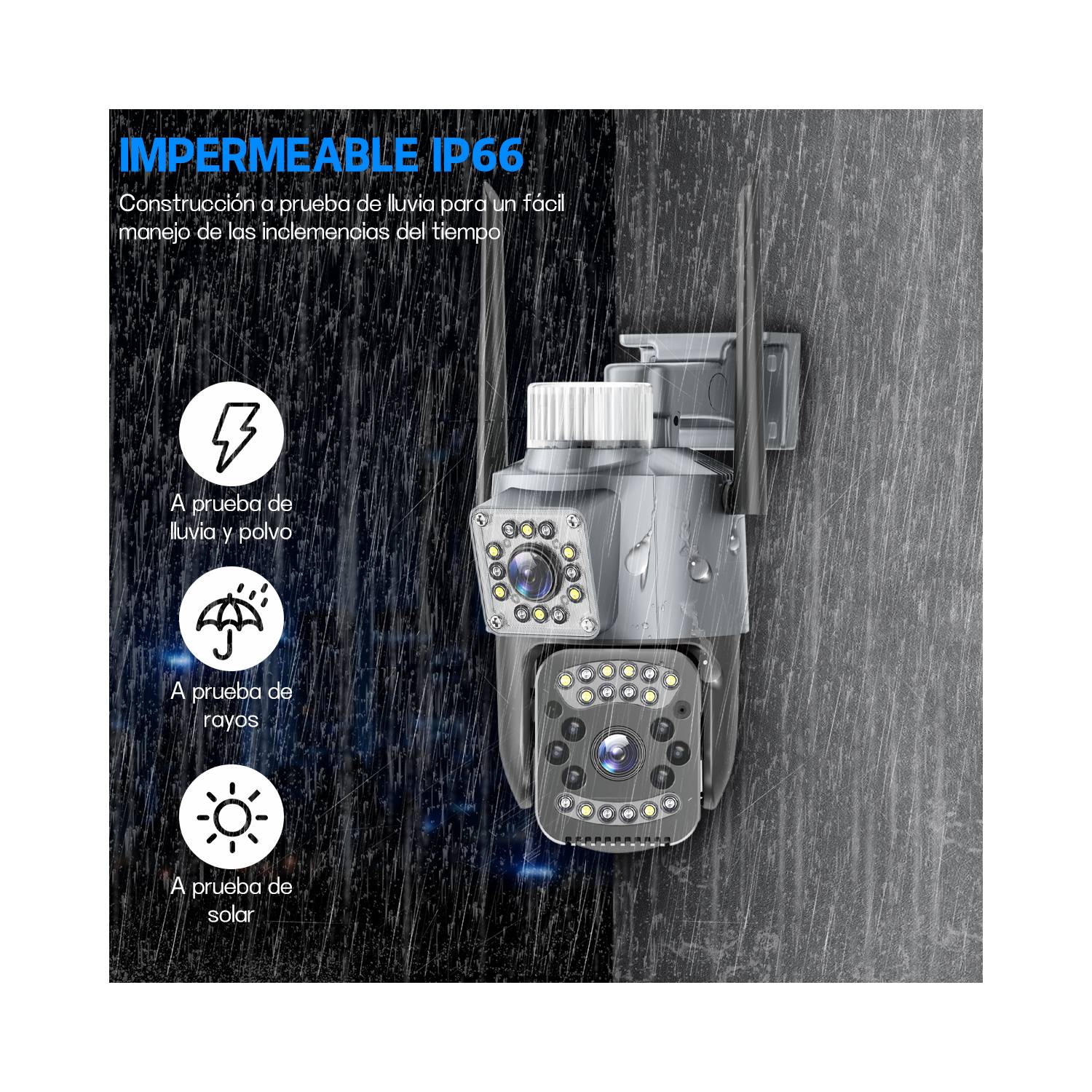 Resistente a las condiciones climáticas adversas: Esta cámara tiene una clasificación IP66, lo que la hace resistente al agua, a los rayos y al polvo. Esto la hace adecuada para su uso en diversas condiciones climáticas adversas. También admite la grabación cíclica de vídeo y el almacenamiento en tarjetas de memoria y en la nube.