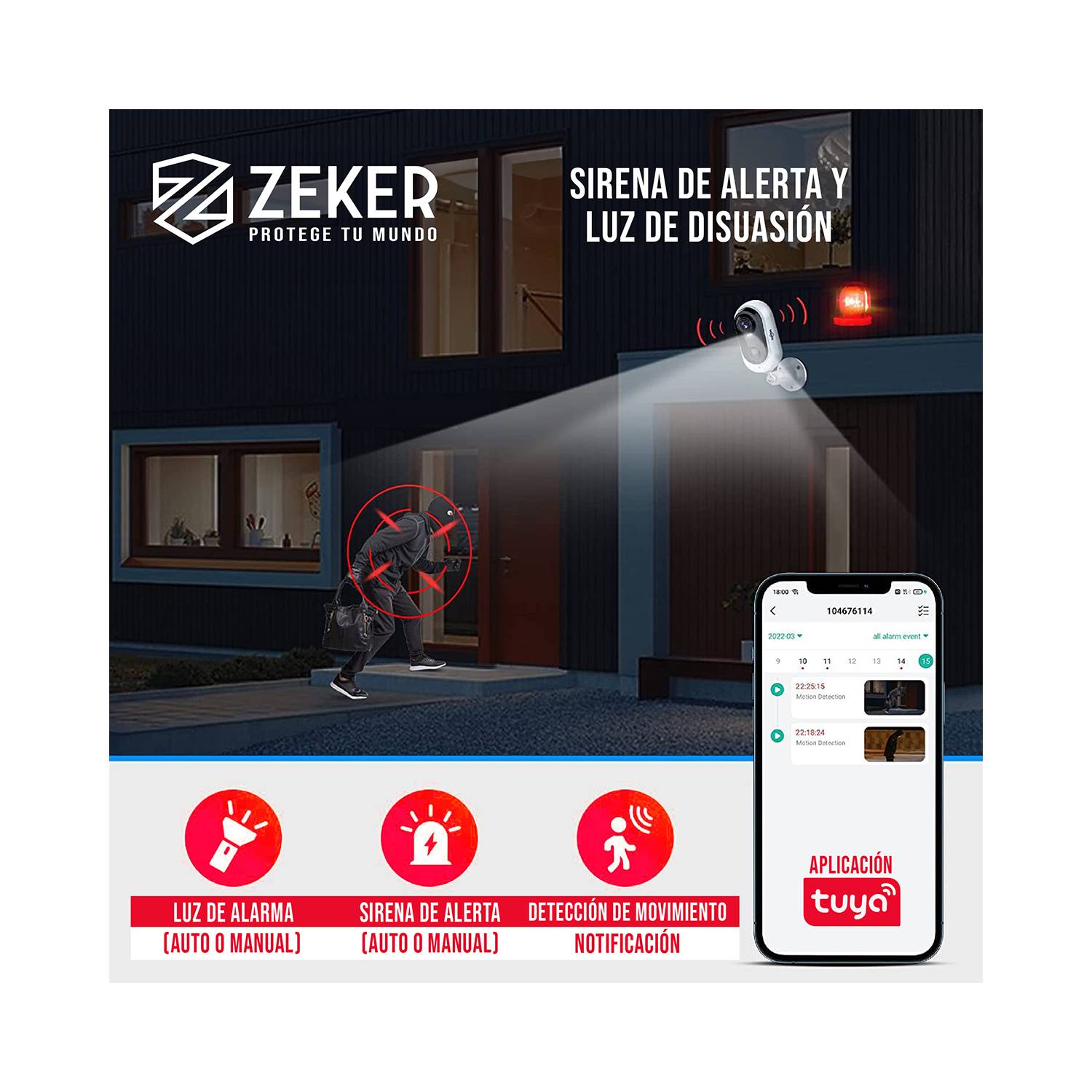 - Alarma: Luz de alarma – Sirena de Alerta – Detección humanoide.